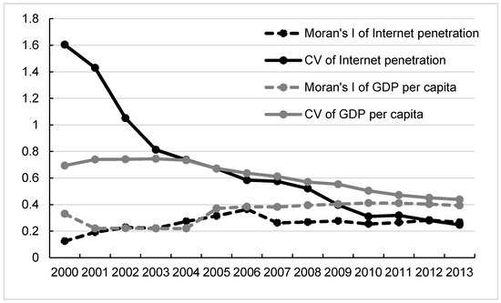 Figure 1 shows how the inequality of China’s Internet penetration and economy has changed in each year from 2000 to 2013. The CV value of Internet penetration has decreased steadily, indicating that regional inequality in Internet penetration was very large at the beginning of the study period and then gradually decreased over time. The CV value of GDP per capita has also decreased, reflecting that regional economies have become more equal over time. When Internet penetration is low, access is often dominated by the privileged. With the growing penetration of the Internet, less developed regions have caught up, and the digital divide seems to have narrowed over time.