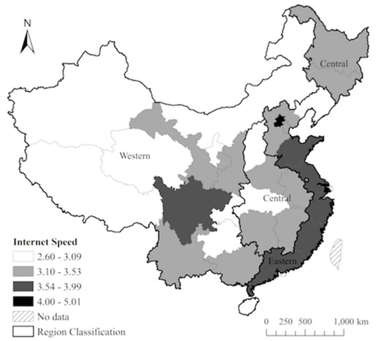 Even though the gap in Internet penetration is narrowing, there are still large regional differences in the speed of the Internet. According to the Broadband Development Alliance [57], the average Internet speed reached 3.53 Mbit/s in 2013. As shown in Figure 3, the Internet speed in eight provinces exceeded the national average in 2013: Shanghai and Beijing had the highest speed (5.01 Mbit/s in Shanghai and 4.39 Mbit/s in Beijing). However, the Internet speed of the western and central regions was significantly lower than that of the eastern region (3.73 Mbit/s). While the regional inequality in Internet penetration has been reduced in recent years and the Internet has become more widely available, there is an increasing difference in the speed of the Internet and the quality of Internet access. Internet speed, as another measure of Internet access, deserves more attention in future studies.