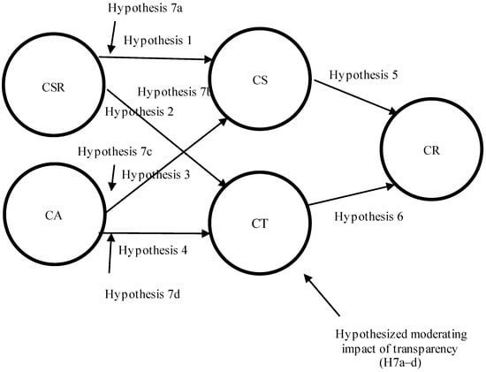 Finally, this study will contribute to the existing literatures through suggesting the moderating role of transparency in understanding the relationship among these constructs. Although some studies report a positive consumer response towards companies engaged in CSR activities, others have found that consumers are not interested in socially responsible practices []. Prior studies indicate the moderators for the impact of CSR practices []. CSR can influence customer response through several means []. However, extant studies neglect relevant moderator variables in these relationships []. Based on the notion, this study assumed that consumers’ response in the interrelationship among CSR, CA, trust, and satisfaction would vary depending on their perceived transparency level.