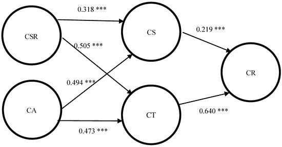 Estimate of the structural model. CSR = corporate social responsibility; CA = corporate ability; CS = customer satisfaction; CT = customer trust; CR = corporate reputation; Standardized coefficients are reported.