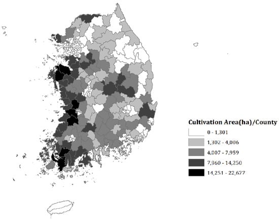 Given the above conceptual model, we considered a case study of rice farming in South Korea as a numerical example. About 797,957 ha was used for rice cultivation in 2015, mostly located in the western part of the Korean peninsula (as shown in Figure 1).