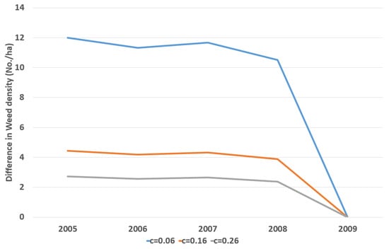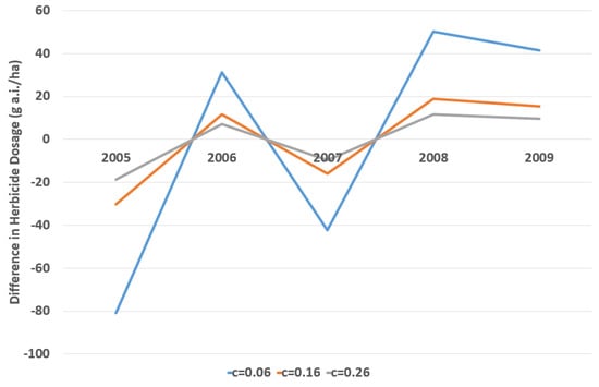 On the other hand, Pandey and Medd [35] found some empirical evidence that herbicide efficacy plays a key role in optimal weed control. Therefore, a sensitivity analysis is presented in this paper to see the effects of herbicide efficacy on farmers’ decisions. There are three scenarios in this sensitivity analysis. The baseline is such that herbicide efficacy (c) is equal to 0.16, where 80% of Sheathed monochoria can be removed if 10 g a.i. of Flucetosulfuron is applied in one hectare of rice paddy field. It follows from Table 5 and Figure 2 that differences in weed seed bank and weed density between two alternate decision regimes are much larger with less herbicide efficacy. For instance, if the efficacy decreases from 0.26 to 0.06, the difference of weed density in the first period increases from 2.7238 (No./ha) to 12.0005 (No./ha). The same result can be obtained in the difference of herbicide dosage as shown in Figure 3.