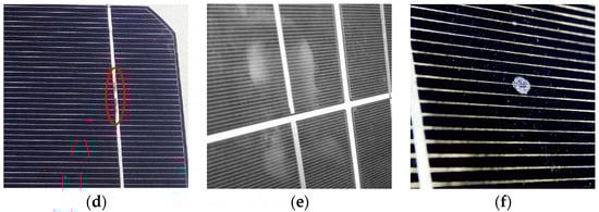 Effects identification examples. (a) Snail track; (b) Cell crack; (c) Hot spot; (d) Busbar discoloration; (e) EVA (ethylene vinyl acetate) discoloration; (f) Bubble formation.