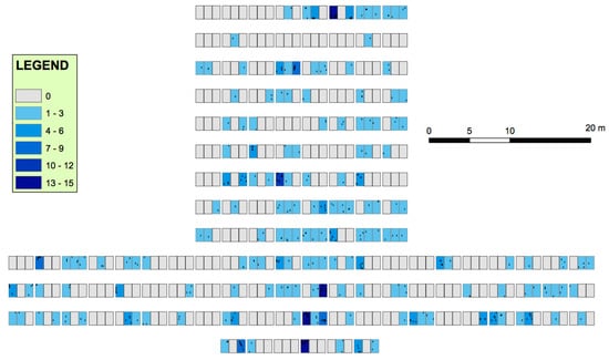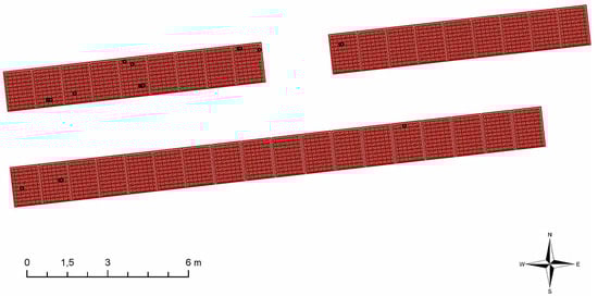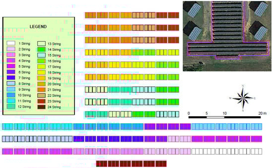 The complete PV power plant was first introduced into the GIS software (ESRI ArcGIS) by aerial ortophotographs and projected geometrical parameters. Thus, the limits of the plots and the geographical position of the PV series strings organization were set. Figure 2 shows both the representation of the analyzed PV plant and the division into strings.