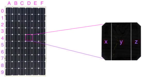 A systematic procedure must be established to identify the geographical position of the defect within the panel. As each photovoltaic module consists of 180 thirds of cells, the following nomenclature was proposed. Each cell in the solar panel is divided into 10 rows (0–9) and 6 columns (A–F). In turn, each cell has been divided into 3 thirds (X, Y or Z), depending on their position. Therefore, when indicating the position of a defect, the third of cell where it is located within the panel can be identified by a three alphanumerical symbols code (e.g., 2CY). Figure 3 shows the adopted identification system on a panel.