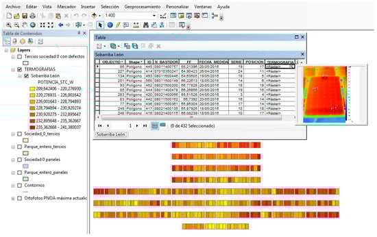 As can be seen in Figure 5, both pictures, thermographies and I-V curves are associated and spatially referenced to each of the modules. This result is very useful as it allows spatially relating the measured attributes in each panel with this graphical information. Moreover, all graphics are available not only from the geodatabase but for quick access through the GIS map.