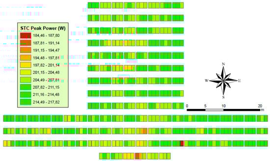 By analyzing Figure 8 and Figure 16, it can be observed that snail tracks may significantly affect the power generation. Some modules with a high number of snail tracks show lower peak power values on STC. However, the thermographies did not detect significant variations on the PV module performance.
