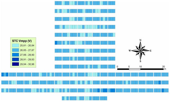 Table 7 and Table 8 show the results for the 9 kWp PV plant. In this case, only four defects were found: snail tracks, blue cells, busbar discolorations, and cell discolorations. Relative apparition rates are not similar to those observed in the previous case study. This fact results in thinking of a spatially and temporally spread process. It can be also observed that, in this case, the impact of the blue cells defect on the STC peak power is much lower than in the previous case. Moreover, although both installations have similar fill factor values for the PV modules, in the second case, higher maximum power current values were measured than in the first case, but lower maximum power voltages.