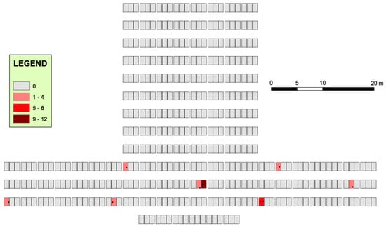 An analysis similar to the previous one can be conducted in this case. However, results for the implementation in the 9 kWp PV power plant have not yet much relevance. As the installation started working recently almost no degradation was observed. However, Figure 20 and Figure 21 show several snail tracks and cell discolorations that may lead to more detailed maintenance needs on these modules. Distributions of both defects are clearly not homogeneous and they seem to be concentrated on the string series extremes.
