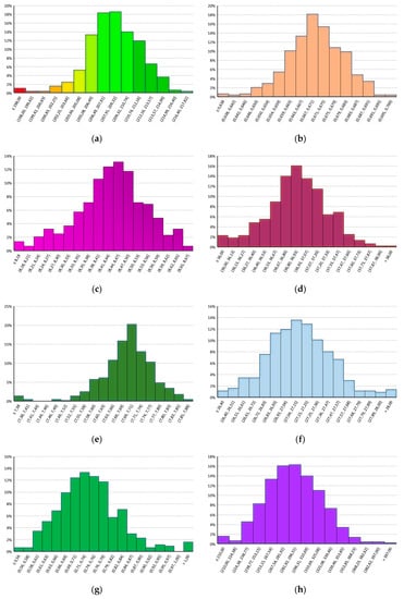 Electrical parameters in STC conditions distributions: (a) peak power; (b) fill factor (c) short circuit current; (d) open circuit voltage; (e) maximum power current; (f) maximum power voltage; (g) series resistance; (h) parallel resistance (9 kWp PV plant).