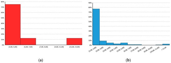 Figure 19 shows both histograms for the hot spots and burn marks (a) and for the snail tracks (b) found in the power plant. Both histograms are expressed in relative terms for the modules affected by the considered fault. PV modules affected by hot spots and burn marks, near 80%, show between three and five faults simultaneously. The other 20% of damaged modules have a greater number of faults with a maximum record of 13 hot spots on a single module. On the other hand, Figure 18b shows that 80% of the PV modules affected by the snail track fault have no more than two faults. Less than 1% of the PV modules damaged this way show more than 11 faults.