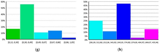Finally, Figure 23g,h shows the histograms for the series and parallel resistances. Fifty-five percent of the modules have a series resistance in the range between 0.30 and 0.49 ohms, while for the parallel resistance, 47% are in the range between 343 and 374 ohms, but a significant 25% of the modules have a parallel resistance lower than 312 ohms.