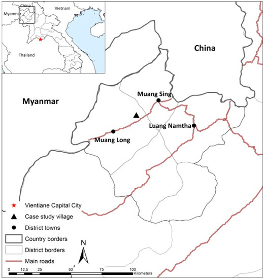 Thinking about human-environment systems as epistemological constructs enables a flexible and empirical approach to the challenge of defining systems and system boundaries. For illustrating and discussing how these perspectives contribute to an empirical telecoupling analysis, we consider the case of banana plantation expansion in a small rural village, Ban Sirimoon, in Luang Namtha Province, Laos (Figure 1). Largely driven by Chinese investments and with a solely export-oriented production, the banana plantations can be conceptualised as a telecoupled land system with a strong spatial and institutional decoupling between the drivers and outcomes of land use change. By working progressively ‘outwards’ in time and space, we traced the actors involved, their relations and interaction, and the (distal) flows involved in the banana boom as a way of defining the ‘banana land system’ (see [82,83]).