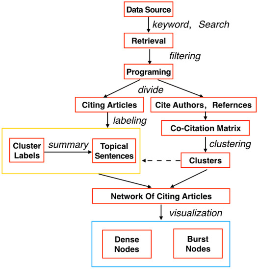 Inspired by Chen’s idea [12,13], we provide an analytical framework to the network of citing articles formed by co-citation clusters to facilitate access and understanding (see Figure 1). After selecting topics of interest, one can obtain data from reliable databases by retrieval with keywords. Relevant articles can be divided into two groups: those being cited by the literature and a co-citation matrix. The co-citation network can be divided by grouping information into several clusters that are non-overlapping and summarize the information in every cluster, including headlines, authors, keywords, abstracts, and bibliographic records. Finally, a noun phrase is extracted as the label, which is called the ‘term’. For quoted passages, singular value decomposition (SVD) results in dimensionality reduction of the clusters. This can accelerate the learning algorithm because one cannot realize the visualization by intuitive graphics if the dimensionality is too high. In the end, we obtain a network of citing articles in which the size of different nodes represents the citing frequency. The dense nodes demonstrate research hot spots and the basic knowledge in the field, and burst nodes in this paper represent research fronts according to Kleinberg’s algorithm (since the first introduction in 2002, it has been playing a significant role in burst-detection techniques and date mining) [14].