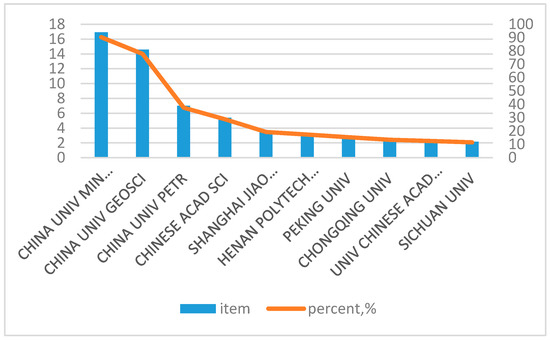 According to the publishing institutions (see Figure 3), the China University of Mining and Technology ranks first and is far ahead of other universities and agencies with 95 published papers. The China University of Geosciences has 81 published papers, and ranks second. The other 8 in the top 10 are the China University of Petroleum, the Chinese Academy of Sciences, Shanghai Jiao Tong University, Henan Polytechnic University, Peking University, Chongqing University, the University of Science and Technology of China, and Sichuan University.
