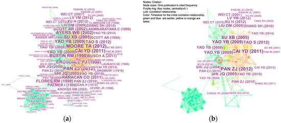 Drawing a map of the co-cited network based on the literature data collected in Section 2 can be achieved by using CiteSpace V. For the best results, the value of time slicing as 1 and defining the node type as ‘cited reference’ were chosen. The top 1% of the most cited or occurring items form each slice. The visualization results were obtained, as shown in Figure 4a. It includes 364 nodes and 1443 lines.
