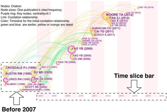 To facilitate the interpretation, each node in the picture represents one citation, and larger node sizes suggest that the publication is cited more frequently, implying that the paper is an important one within the knowledge domain. Link colors correspond directly to each time slice; for example, blue indicates the earliest citations. The most recent co-citation relationships are visualized as yellow or orange links. Purple rings indicate higher values for this metric. Larger node sizes suggest that the publication is cited more frequently and implies that the paper is an important one within the knowledge domain. Publications with large node sizes and purple rings are worth further discussion because they reflect primacy or dominance in this knowledge domain.