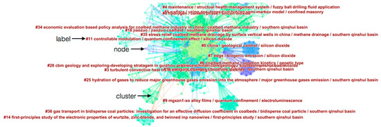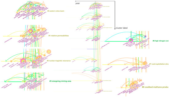 Finally, combining Figure 5 and Figure 6 into a knowledge tree mapping (as seen in Figure 7), the cluster labels that represent the research hot spots by rank order comprise the vertical axis. The nodes are arranged horizontally, chronologically, and linked with different colored lines. Blue indicates the earliest citations, whereas orange indicates the most recently made citations. The larger nodes or nodes with purple rings show more important value. For example, if someone wants to know about some information of the Eastern Ordos basin, Su’s work is the most cited [19] and Tao’s [27] paper is the latest research.
