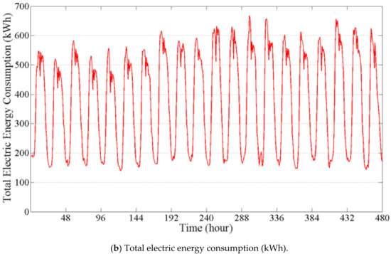 An existing high-rise office building was selected. The building has 10 stories above ground and three underground levels. In this study, the BEMS data were used including total electric energy consumption at a sampling time of 1 h during 20 weekdays in July (Figure 1). The BEMS data were used as training and validating data for constructing two inverse models (SVR and chaos time series inverse model) based on machine learning and chaos theory. The data were divided as follows: (1) 15 days for development of the model, (2) 5 days for validation of the model.