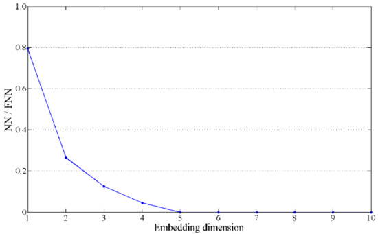 The FNN algorithm proposed by [22] is used to estimate the minimal sufficient embedding dimension. When state vectors are reconstructed while a random embedding dimension is increased, the state vectors are divided into their nearest neighbours ( in Equation (3)) and false nearest neighbours ( in Equation (4)) according to the Euclidean distance of each state vector. The closer to the embedding dimension FNN ratio ( in Equation (5)) gets, the less the FNN ratio becomes. Based on the aforementioned characteristics, the embedding dimension can be obtained using the FNN ratio.