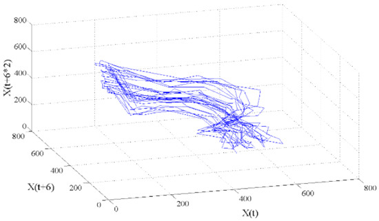 Figure 3 and Figure 4 show the results of the embedding dimension and time delay calculated by the FNN algorithm and AMI, respectively. The calculated embedding dimension and time delay were 5 and 6, respectively. Figure 5 shows the 3D projection (i.e., ‘strange attractor’) of 5D phase space having a delay time of 6 h, resulting from the measured one-dimensional time series data. The strange attractor suggested by [27], which can be represented geometrically in d-dimensional phase space, formulates repeating patterns in the d-dimensional phase space having the delay time, and the orbit or trajectory of the strange attractor moves in a deterministic but unpredictable manner [28]. Due to the deterministic manner, it can capture dynamic natures of nonlinear systems using the flow of a curve with the observed finite set of points, and such repeating patterns can be used to predict future states. In other words, the measured raw BEMS data, which were dependent on the embedding dimension and time delay, were transformed into new vector time series (1D → 5D phase space having a delay time of 6). The new vector times series were used as training data for the inverse model. In other words, the chaos time series inverse model is constructed by coupling between new vector time series and inverse model (SVR). Due to an increase of dimensionality, the chaos time series model (Chaos SVR) has a minor increase in computation cost in comparison to the inverse model (SVR). However, the difference in computation speed between Chaos SVR and SVR is imperceptible.