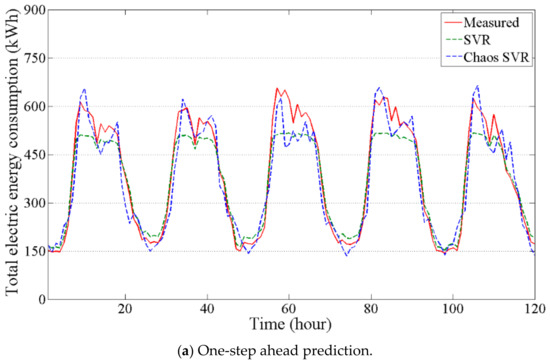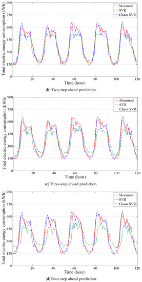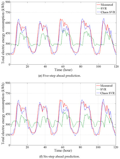 Figure 6 shows the predicted outputs of the inverse model (SVR) and chaos time series inverse model (Chaos SVR) with varying k-steps (1, 2, 3, 4, 5, and 6). When the number of steps (k) increased, the prediction accuracy of the SVR significantly decreased. It can be inferred that the SVR was unsuitable for multi-step ahead predictions (e.g., for multi-step ahead MPC). On the other hand, the prediction accuracy of the Chaos SVR using state orbits of the reconstructed d-dimensional phase space was good compared to the SVR. In other words, the chaos time series inverse model can provide more accurate long-term outputs than the inverse model. In light of the above, the chaos time series inverse model is advantageous for providing multi-step ahead predictions. This means that energy flows of nonlinear dynamical systems can be modelled using the strange attractor and greater future changes (total electric energy consumption) incurred from various unknown minor changes (e.g., occupants’ actions) can be sufficiently predicted.