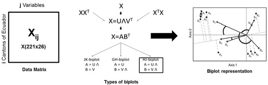 Let X be a data matrix composed by I individuals measured on J variables. The Singular Value Decomposition (SVD) of X is defined as X = U∧V⊺, where U is a matrix whose column vectors are orthonormal and correspond to the eigenvectors of XX⊺, V is a matrix whose column vectors are also orthonormal and correspond to the eigenvectors of X⊺X, and ∧ is a diagonal matrix containing the singular values arranged in decreasing order. The database used in this study was structured in an I × J data matrix in which the I rows correspond to the 221 Cantos of Ecuador and the J columns correspond to 26 MuSIASEM variables showed in Table 1. The results allow a simultaneous representation of the data and it gets the maximum quality of representation both for the rows and for the columns of the data matrix. In the Biplot representation, the column markers bj are shown as arrows and the row markers as points. The rules for interpreting the HJ-Biplot are: the distances between rows markers are interpreted as inverse similarities (closer individuals are more similar); the lengths of the column vectors approximate the standard deviation of the variables; the cosines of the angles between the column vectors approximate the correlations between variables and row and column markers can be shown in the same Cartesian system with optimal quality of representation [41]. See Figure 1.