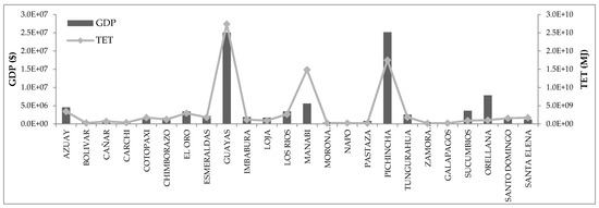 The Total Energy Throughput (TET) of the provinces of Ecuador is relatively constant in 21 places (below the 5 × 109 MJ), with the exception of Guayas (2.74 × 1010 MJ), Pichincha (1.75 × 1010 MJ) and Manabí (1.49 × 1010 MJ), that correspond to the most populated places of Ecuador according to the INEC. The highest number of industrial establishments, according to the INEC, is located in the provinces of Pichincha (27%) and Guayas (16%), which correspond to the provinces with the highest Gross Domestic Product (GDP). It is important to note that of the 221 cantons of Ecuador, Guayaquil (in Guayas) and Quito (in Pichincha) contribute 42.8% of the country’s GDP. See Figure 2.