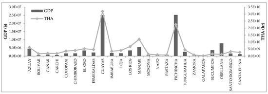 The Total Human Activity (THA) represent the total human time available for conducting different economic activities and the human activity in the household. The THA of Ecuador is higher in the most populated province and with the highest number of industrial establishments, like Guayas (3.19 × 1010 h) and Pichincha (2.26 × 1010 h). See Figure 4.