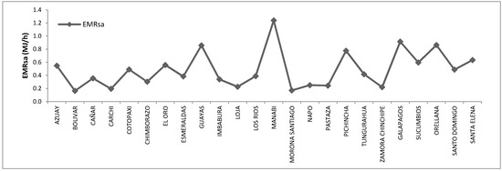 When looking at the Exosomatic Metabolic Rate (EMRSA) performance of the provinces of Ecuador we see a peak in Manabí of 1.24 MJ/h, this is because energy consumption of the Manabí grew faster than its population, according to the INEC [42], Manabí has a population growth of 1.60%, while Guayas and Pichincha, which are the most populated places of Ecuador, have a population growth of 1.08% and 0.84%, respectively. See Figure 5.