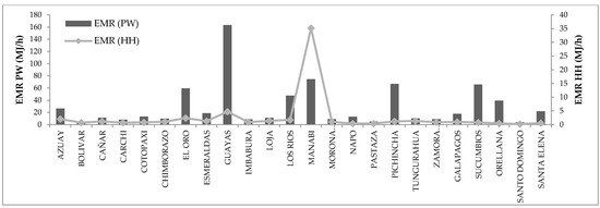 The Exosomatic Metabolic Rate of the productive sector (EMRPW) can be used as a proxy for the level of capitalization of the economy. On the other hand, the Exosomatic Metabolic Rate of the households (EMRHH) can be used as a proxy for the level of material standard of living of households [43]. When looking at the data of Ecuador, we see that the EMRPW is high in Guayas with 163.44 MJ/h, the economic structure of Guayas is based on the agricultural, fishing, manufacturing, commercial and construction sectors. The most important economic sector in Guayas is the manufacturing sector; this sector introduced machinery and technology and therefore boosted productivity. The highest metabolic pattern of households in Ecuador is located in Manabí with 35.18 MJ/h, showing that the largest increase in energy consumption was directed to increasing the material of standard living. This confirms that a large fraction of the increase in energy consumption was not oriented towards capitalization in the productive sectors (and then towards increased labor productivity) but was oriented towards increasing consumption levels in households, a fact that resulted in a decreased income per hour worked in productive sectors [33]. See Figure 6.