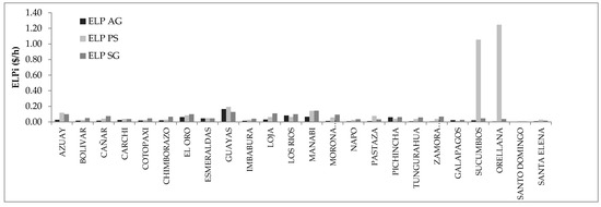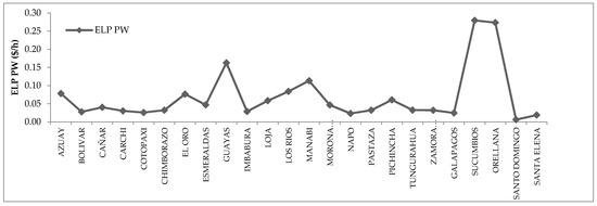 Figure 7 shows the Economic Labor Productivity (ELPPW), where Sucumbíos and Orellana have the highest value in ELPPW, 0.28 ($/h) and 0.27 ($/h) respectively. This is because Sucumbíos (Cantons of Putumayo and Cuyabeno) and Orellana (Canton of La Joya de los Sachas) belong to the oil regions of Ecuador.