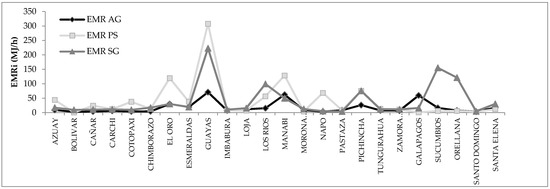 The highest values of Exosomatic Metabolic Rate per economic sector (EMR) in Ecuador are located in the Productive Sector (PS), with the exception of Los Ríos, Sucumbíos and Orellana; these three places have high values of EMR in the Service and Government Sector (SG). In Figure 8 we can see that the three economic sectors peak in Guayas; in this place the PS Sector (EMRPS), composed of industrial activities with a high material requirement and energy demand, has the highest level of EMR per hour (307.61 MJ/h). This is because the most important economic sector in Guayas is the manufacturing sector. Also the Services and Government Sector (SG) has an EMR per hour of the 222.80 MJ/h and the Agriculture Sector (AG) has an EMR per hour of the 70.94 MJ/h.