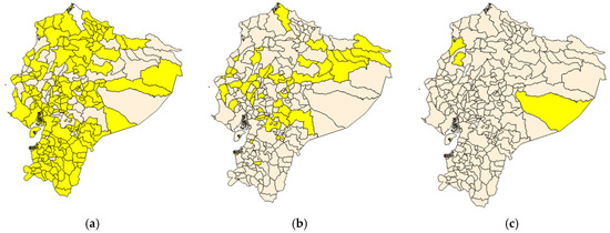 The relative contribution of the q-th factor to row element i: (a) Cantons of Ecuador that characterize axis 1; (b) Cantons of Ecuador that characterize axis 2; (c) Cantons of Ecuador that characterize axis 3. Source: Own Elaboration using QGIS 2.18.4.