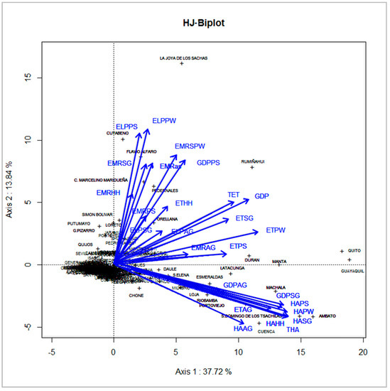 In the HJ-Biplot axis 1 was related to: ETPS, EMRAG, ETPW, GDPSG, GDPAG, HAPS, HASG, ETAG, HAPW, THA and HAHH; this means that places located on the right side of factorial axis 1 have higher values of the MuSIASEM indicators then those located on the left side of the Biplot representation, for example, in Figure 11, places like: Orellana (Canton of Orellana Province), Rumiñahui (Canton of Pichincha Province), Machala (Canton of El Oro Province), Ambato (Canton of Tungurahua Province), Santo Domingo de los Tsáchilas (Canton of Santo Domingo de los Tsáchilas Province), Portoviejo (Canton of Manabí Province), Manta (Canton of Manabí Province), Durán (Canton of Guayas Province), Latacunga (Canton of Cotopaxi Province), Loja (Canton of Loja Province), Esmeraldas (Canton of Esmeralda Province), Cuenca (Canton of Azuay Province), Quito (Canton of Pichincha Province) and Guayaquil (Canton of Guayas Province).
