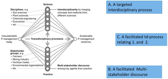 Td processes include representatives of all stakeholder groups, and Td is based on fundamental principles of basic Western democracy, such as a pluralistic perspective the principle of “accepting the otherness of others”. Within the Zurich 2000 conception of Td [,,], science is considered a public good that serves all stakeholder groups operating within the framework of human and constitutional rights. This compels science to play a special role as a societal institution that contributes to the knowledge necessary to maintain the viability and development of all core layers of society and humanity. The special relationship between science and multi-stakeholder discourse is presented in Figure 1. Three main streams should be involved in a Td process in the case of sustainable transitioning of the (global) phosphorus cycle. We distinguish among (A) a targeted interdisciplinary process in which the knowledge from social, natural, engineering, and humanity science is involved; (B) a mitigated multi-stakeholder discourse for a case study on (global) sustainable phosphorus management in the Global TraPs project [] that includes representatives from all key stakeholder groups; and (C) a (professionalized) facilitation relating these two streams under a co-leadership model from science and practice [,,,]. We suggested that these processes should become the subject of (professional) facilitation.
