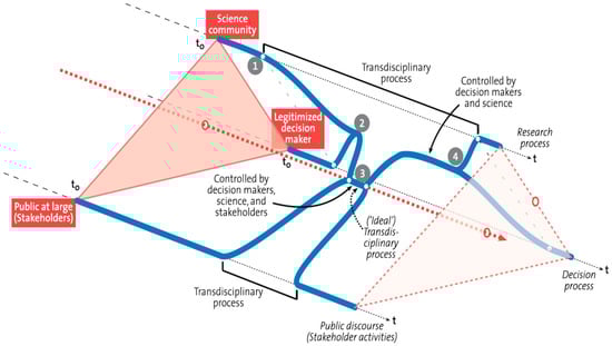 Td processes aspire to serve all stakeholder groups based on the democratic framing of society, and Td can be considered a democratic “policy-tool development for the implementation of sustainability” []. Td projects are—ideally—co-governed by a democratically legitimized decision maker (e.g., a lord mayor) and scientists on an equal footing, and they include the knowledge and values of all concerned (see Figure 2). The selection of the representatives of key stakeholder groups is based on a comprehensive system model that allows participants in the process to deal with critical issues that have been included in a guiding question [,,,]. The guiding question and the system model are identified in a process that emerges from the initial views of the science and practice leaders (see Section 2, Figure 2), and they are developed in a sequential process that includes representatives of all relevant groups that may affect, are affected by, or are interested in critical system changes related to the guiding question.