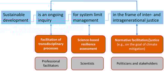 From their earliest beginnings, Td processes [] have been dedicated to sustainable transitioning. For understanding scientists’ conceptions of sustainability and to better distinguish between the normative and societal dimensions, Laws et al. [] investigated the notion of 21 projects that were run jointly at the Massachusetts Institute of Technology (Boston), ETH (Zurich and Lausanne), the University of Tokyo, and Chalmers University of Technology (Gothenburg). This investigation led to the notion that sustainable development is a proactive, ongoing inquiry (i.e., multi-stakeholder and interdisciplinary process; see Figure 1) on system-limit management (i.e., on preventing hard landings and collapses of valuable systems) in the framework of inter-and intragenerational justice (see Figure 3). Naturally, the social norms and values of the stakeholders also affect what the inquiry—i.e., the process of sustainable transitioning—looks like. We may consider this definition a systemic variant of the Brundtland definition [], which distinguished between a facilitation process, a science-based resilience analysis and assessment, and a normative, justice-based dimension.