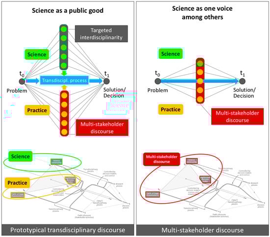 For instance, this author [] shifted the Nowotny et al. [] concept of “socially robust solutions” to “socially robust orientations” ([]; see Box 1). This was done most often when running a Td process with the Swedish and Swiss nuclear power industry and its stakeholders [] that called for a sensitive definition of shared and differentiated responsibility and accountability. Scholz distinguishes three different roles participants may play in a Td discourse (see Figure 2), i.e., legitimized decision makers, scientists, or concerned citizens (stakeholders). The term orientation also stresses that mutual learning between science and practice is a basic principle []. As presented in Figure 1, Td processes establish a temporary collaboration between science and practice. “Socially robust orientations” are related to real-world decisions, but they are “if–then” types of relationships on actions and impacts that decision makers may learn from and utilize. “If you want to have X, then do not do Y because”. The phrase socially robust orientation acknowledges the specific constraints (including democratic compromise) under which real-world decisions are made. Scientists are not democratically legitimized decision makers as are lord mayors or owners of real estate or companies. However, they may help decision makers to improve their decisions as well as the outcomes of these decisions. Actionist approaches such as TM tend to be more direct and also work with recommendations [].
