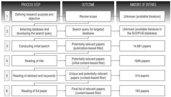 After the initial statistical screening, contributions were analyzed with the help of an ad-hoc classification scheme. For this, the idea of a “concept matrix” for this study was taken and adapted from and [22]. A concept matrix is a logical approach that defines several “concepts” (that may be variables, theories, topics, methods, and so on), where all articles are grouped in and therefore serve as a classification scheme. New concepts could be added during the classification process until the final scheme was developed. The first step was an initial development of the classification scheme based on prior literature. The identified articles were read afterwards and classified according to the scheme. If there were any doubts in classifying a specific article, the scheme was refined, i.e., concepts and categories were added, expended, or modified. In this case, prior classified articles had to be checked again to validate their classification within the refined scheme.