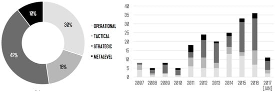 The full text filtering activity (see Figure 1) rendered a final list of 193 papers, which originated from a total of 104 journals (1.86 papers per journal). Statistical analysis (Figure 2) reveals that the topic of value and sustainability modeling is expanding at a steady rate since 2007, with a significant jump forward in 2011. Projections for 2017, which are based on the amount of contributions published during January 2017, point to a further increase compared to 2016. The Strategic level is the most popular hub for publications in the topic of the proposed query, hosting more that 42% of the papers selected for review. Strategic level contributions are also trending when observing the distribution of publications in the last five years, peaking in 2016 both in absolute and relative terms. A significant amount of contributions refers also to the Operational level (30%), but their number is observed to decrease since 2014, even though such trend seems to be likely broken in 2017 when extrapolating the January data. Tactical level (30%) and Metalevel contributions (10%) are less frequent and do not show any evident pattern through the years.