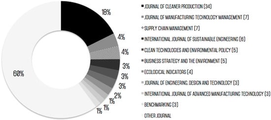 Figure 3 summarizes the distribution of publication sources for the selected 193 papers. Noticeably, only 10 journals feature three or more items in the final paper list. The Journal of Cleaner Production (JCP) is a primary source of contributions in relation to the proposed search query and inclusion criteria, featuring 34 hits (18% of the total), while the Journal of Supply Chain Management and the Journal of Manufacturing Technology Management feature seven hits (4%) Notably, 60.2% of the papers considered relevant in the review comes from journals that feature only one hit.