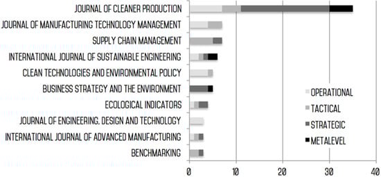 Figure 4 displays the distribution of hits at Strategic, Tactical and Operational level, as well as at Metalevel, for the 10 most popular journals. JCP (5 hits), the International Journal of Sustainable Engineering (2 hits) and Energy Policy (2 hits) are where most of the Metalevel contributions originate. JCP (19 hits) and Business Strategy and the Environment (4 hits) are where most the papers at Strategic level have been collected. JCP (4 hits) and the journal of Supply Chain Management (4 hits) are those featuring the highest number of hits at Tactical level. At Operational level, JCP (7 hits) and the Journal of Manufacturing Technology and Management (5 hits) top the list, while Clean Technologies and Environmental Policy follow closely with four hits each.