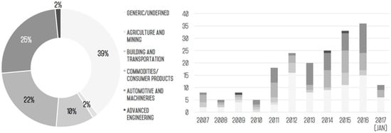 Contributions were grouped in macro industrial sectors to where methods and tools are more popular (i.e., to understand where their application is likely more mature). It is observed (Figure 6) that most contributions do not point to any specific sector (6). Of the remaining contributions, about ¼ of the total focuses on commodities and consumer products, while less than ¼ on more advanced engineering applications (mostly in the domain of automotive and manufacturing equipment). A significant amount of contributions (12%) comes from the building and transportation sector. Figure 6 also reveals that no evident pattern or trend can be observed when analyzing the yearly distribution of the 193 hits.