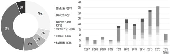 The analysis also aimed at categorizing the type of entity studied by researchers at each level. Figure 7 shows that sustainability and value analysis is popular in the domain of product development. More than 43% of the papers selected from the SCOPUS refer to “hardware” when discussing and exemplifying models encompassing sustainability and value considerations. Often, the focus of sustainability and value modeling lies on a different type of entity, i.e. models are applied for evaluating and benchmarking companies, enterprises and institutions. This is common in literature dealing with the Tactical level, and within the field of supply chain management. Several publications (10%) originate from the domain of service and Product Service Systems (PSS) design. At Operational level, it is not uncommon to observe contributions that focus on the implementation of sustainability/value approaches for material selection. In addition, in this case the yearly distribution of the analyzed papers is balanced, and no evident trends can be observed.