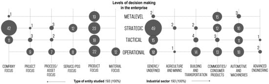 One of the most noticeable gaps in the proposed mapping relates to the very few contributions addressing advanced engineering applications, which is covered in the review by only three publications. Most contributions at Metalevel refer to consumer products and commodities, with only few referring to automotive and machineries, and none being found to focus on the domain of advanced engineering. Contributions at Strategic level do not refer to a specific industrial sector, and only sporadically borrow examples from specific case studies. Most contributions at this level also address a company perspective and aim to assess the value of a company’s sustainability profile. At Tactical level, contributions mainly originate in the domain of automotive, even if most papers at this level do not make specific reference to the industrial sector studied. Both “product” and “company” focus is common when looking at the type of entity studied when looking at corporate material and immaterial resources. At the same time, it is possible to observe a lack of entries in the SCOPUS database concerning Tactical-level contributions dealing with services and Product-Service Systems (PSS). Eventually, examples at Operational level are well distributed across all macro industrial sectors considered in the analysis. They are also balanced with regards to the type of entity being studied, with a large share of contributions targeting the field of material assessment and selection.