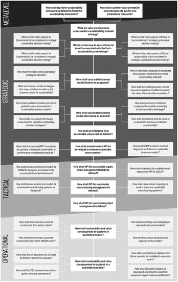 An additional layer, named Metalevel, was added on top of the initial categorization to spotlight higher-level contributions discussing value and sustainability in terms of customer perception (of sustainable products or services) and frameworks for sustainability implementation (that can be cascaded down to strategic, tactical and operational levels).