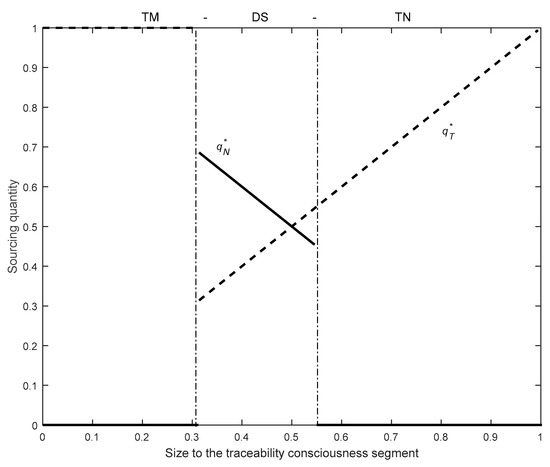 Part(i) of the proposition is similar to Proposition 2, and Part(ii) shows that while or increases, the buyer will increase the sourcing quantity and decrease the sourcing quantity , which is counterintuitive. Figure 1 illustrates an instance of the buyer’s optimal sourcing quantities from different suppliers, where the second transition path in the case occurs. As the figure shows, for low , the TM strategy is optimal, whereas for moderate , the DS strategy is optimal, and for high , the TN strategy is optimal. As increases above 0.314, the sourcing quantity from the type supplier decreases from 1 to discontinuously, whereas that sourced from the type supplier jumps from 0 to . It is obvious that as the size of the traceability consciousness segment or consumer WTP for traceability increases, the buyer could gain more profits from the market in terms of these consumers (by adopting the DS or TN strategy). In other words, the buyer transits to a market segmentation strategy by selling traceable food products to traceability consciousness consumers at a higher price. If the size of the traceability consciousness segment or consumer WTP for traceability is sufficiently high, the buyer will dedicate their operation to serving traceability consciousness consumers, but exclude the non-traceability consciousness ones.