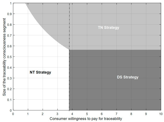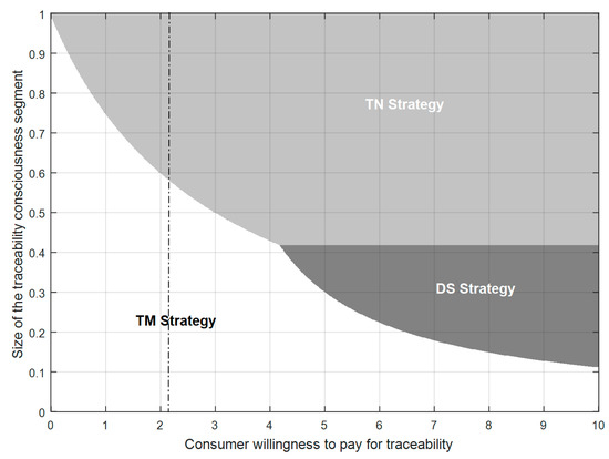 Considering the second case, where the consumer WTP for traceability is high (), the optimal strategies of the buyer are the DS strategy, TM strategy, and TN strategy. Intuitively, in this case, the DS strategy dominates the NT strategy. From Table 2, we can find that the expected profit of the TM strategy is independent of , and that of the TN strategy increases in . Moreover, the buyer’s expected profit under DS strategy may increase as increases (case ), or decrease as increases (case ). Thus, in the case , three potential transition paths of the optimal strategy exist: (1) DS strategy → TN strategy; (2) TM strategy → DS strategy → TN strategy; and (3) TM strategy → TN strategy. The effect of and on these transitions can be summarized as the following proposition.