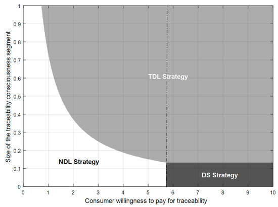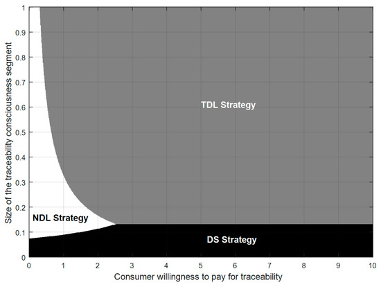 Based on the previous numerical experiment, we set and to examine the impact of an additional cost for mislabeling. Figure 5 illustrates the optimal strategies of the buyer in this case. Compared to Figure 4, we can find that the size of the optimality regions of NDL decrease, while the regions of both the DS and TDL strategies increase. This suggests that imposing an additional cost for immoral mislabeling may produce an intended consequence of sourcing more from a traceable supplier, and thus contribute to sustainable traceability.